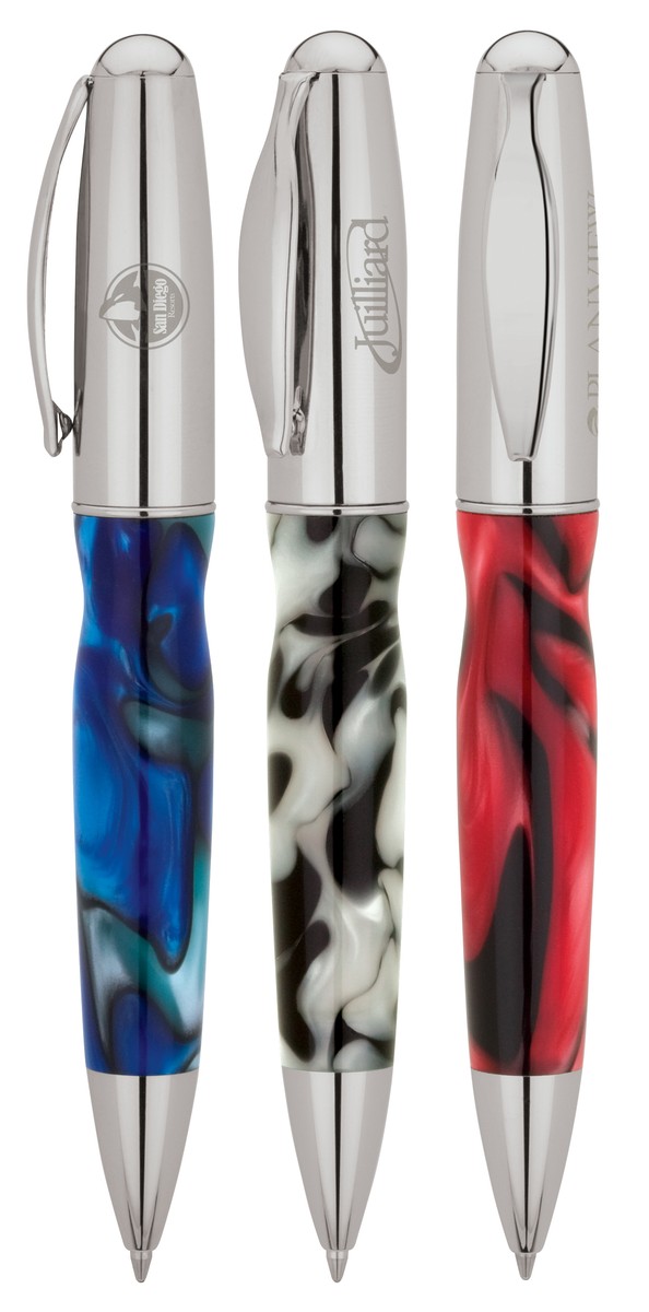 Twist-action mechanism, swirled resin barrel, chrome finish brass cap. Complies with Prop 65. 3/4" W x 5 1/8" H x 9/16" D