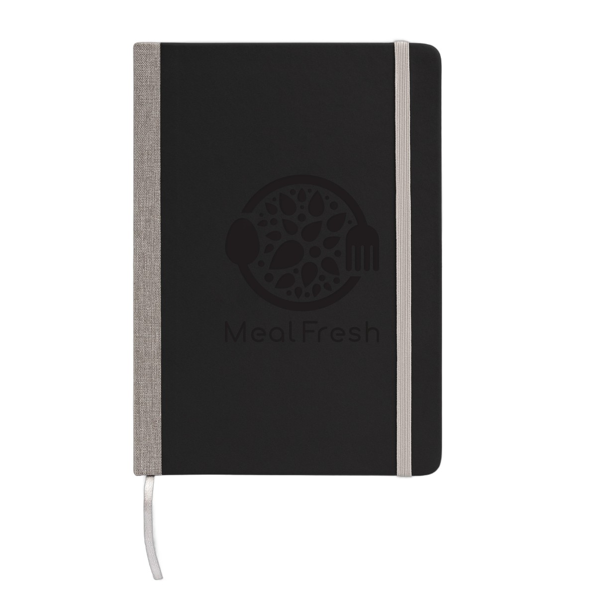Discover the practicality of our Steinbeck - Two Tone Hard Cover Notebook, crafted for daily use. The front cover features durable recycled PU art card, complemented by a 2-tone RPET gray back and spine. It boasts a convenient gray elastic strap and pen loop on the back cover for secure closure and easy access. Inside, you will find 96 sheets (192 pages) of responsibly sourced paper in ivory color with Collegiate lines, ideal for organized note-taking, whether jotting down creative ideas or detailed meeting notes. The book-bound design ensures durability and a polished appearance, enhancing the professional look and feel. Compact at 5.91" x 8.27" x 0.51", this notebook seamlessly blends style with functionality. Whether used for brainstorming sessions or capturing inspirations on the go, it's a versatile companion for any writing endeavor. Show your brand's true colors with ColorJet, our full-color inkjet imprint process. Complies with Prop 65. 8.27" H x 5.91" W x 0.51" D