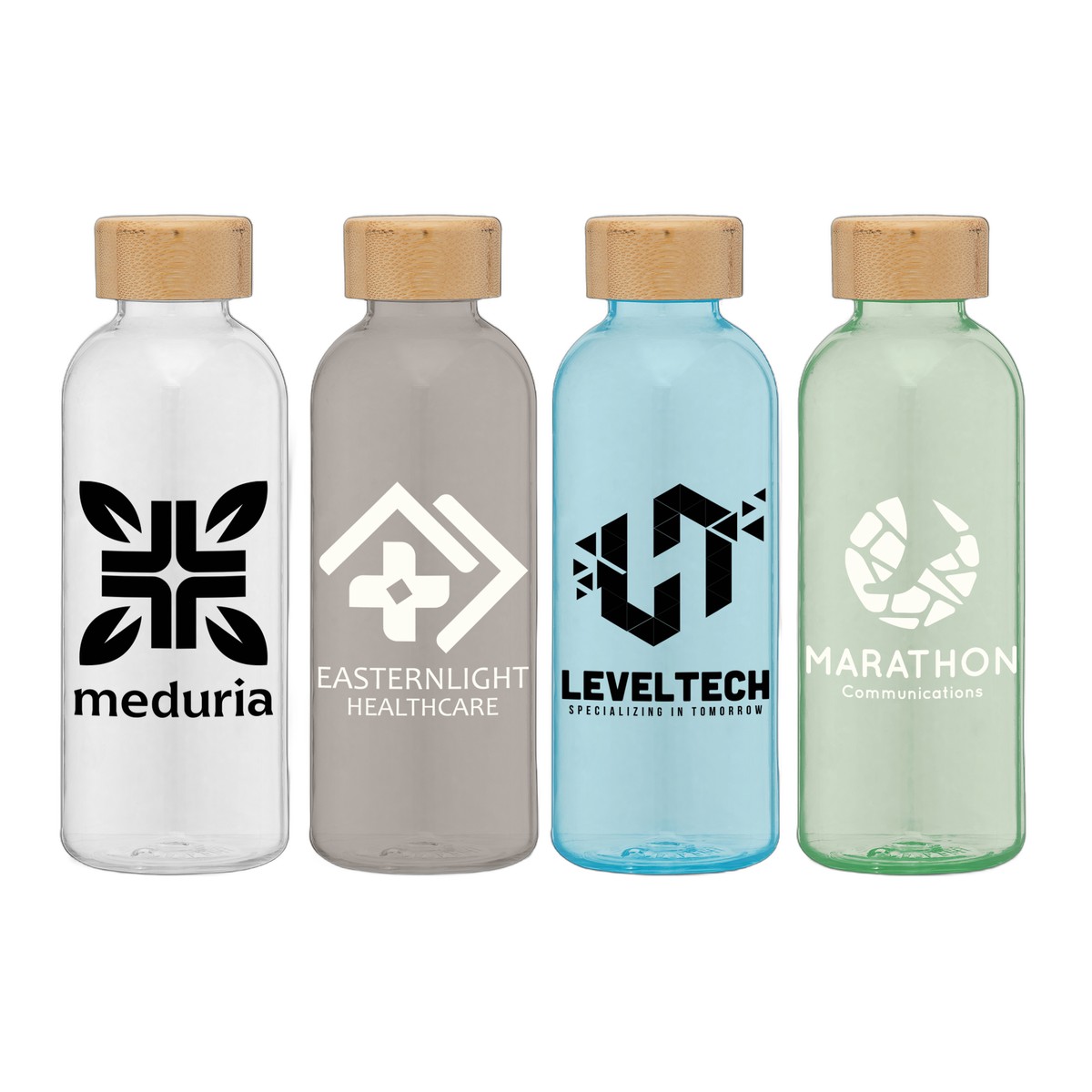 The Strom 22 oz. Water Bottle pairs everyday functionality with a modern, natural finish. Made from lightweight rPET plastic, this single-wall bottle is ideal for cold beverages on the go. It features a twist-on lid with a smooth bamboo outer surface and a secure leakproof seal. The wide-mouth opening makes it easy to refill, while the clean, minimalist design is perfect for active routines, daily commutes, or desktop hydration.. Show your brand's true colors with ColorJet, our full-color inkjet imprint process. Complies with Prop 65. 8.07" H x 2.91" W