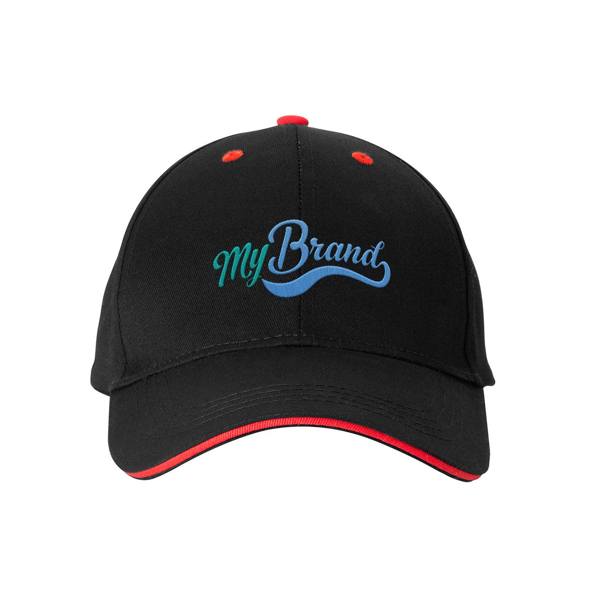 Structured baseball cap made of 100% Cotton Twill with color contrast sandwich visor. Features 6 panels with sewn eyelets and adjustable fabric strap with two-piece hook and loop fastener tab closure. Medium profile and pre-curved visor. Hand wash only. Line dry.
