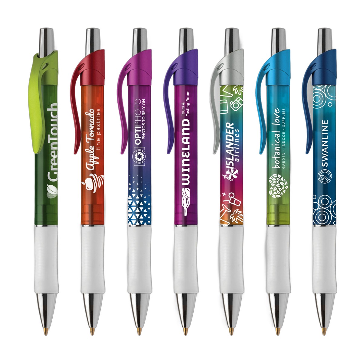 ***Temporarily unavailable.*** This plastic ballpoint pen features a wide translucent barrel coupled with a unique ombré treatment that shows off the progression of color across the barrel. A matte metallic clip, bright chrome accents and a clear, frosted grip round out this trendy pen. Choose from a variety of vibrantly colored translucent barrels, all with an ombré treatment that takes a selected color from light to dark. Complies with Prop 65. 5.87" W x 0.43" D