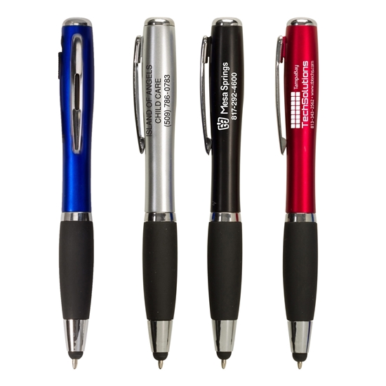 Retractable, Contoured Body, Rubber Tip, Medium Point, Pocket Clip, Comfort Grip, Writing Instrument, Light, Flashlight, Pointer, and Twist Action.