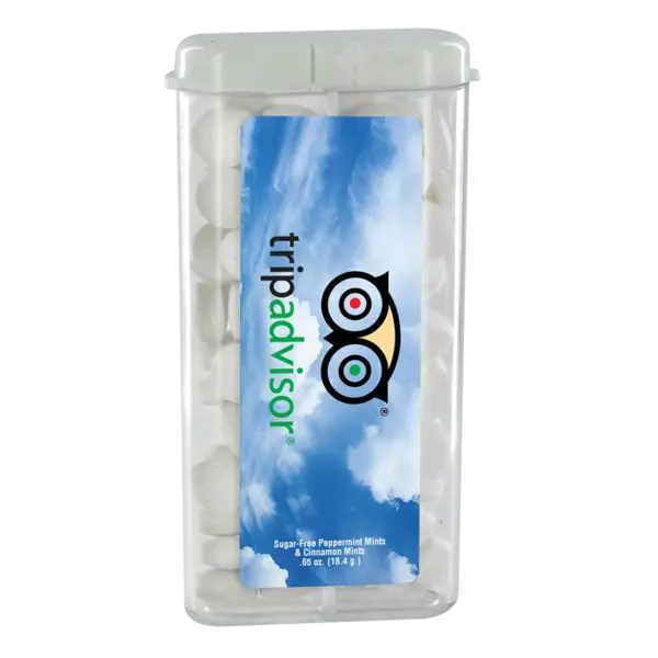 Sugar-free, gluten-free mints at a conference = something nobody ever turns down. And with your logo all over the box, that's guaranteed brand awareness with every "Oh, yes please!" you receive. The top of the handy dual dispenser flips up satisfyingly, so you'll get an encouraging 'click' with every new lead you make. Don't you want to flip the script of the giveaway game with this box of mints—fresher than anything else being handed out at your next promo event or conference. Complies with Prop 65. 1.75" W x 3" H