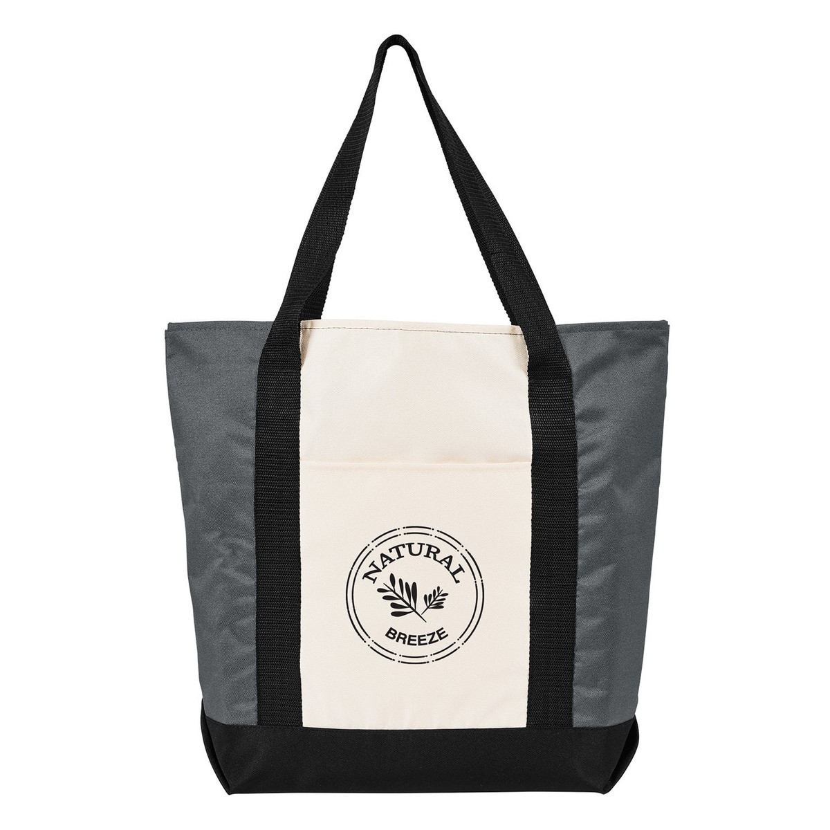 Large open tote made of eco-friendly 600D Recycled Polyester. Sleek design featuring clean lines and modern color blocking. Roomy main compartment with small open slash pocket. Front open slash pocket for extra organization. 45"L x 1.5"W Polyester handles. Hand wash cold, air dry, do not iron. Recommended weight tolerance: 22 lbs. 14.4000" W x 17.5000" H x 6.7000" D