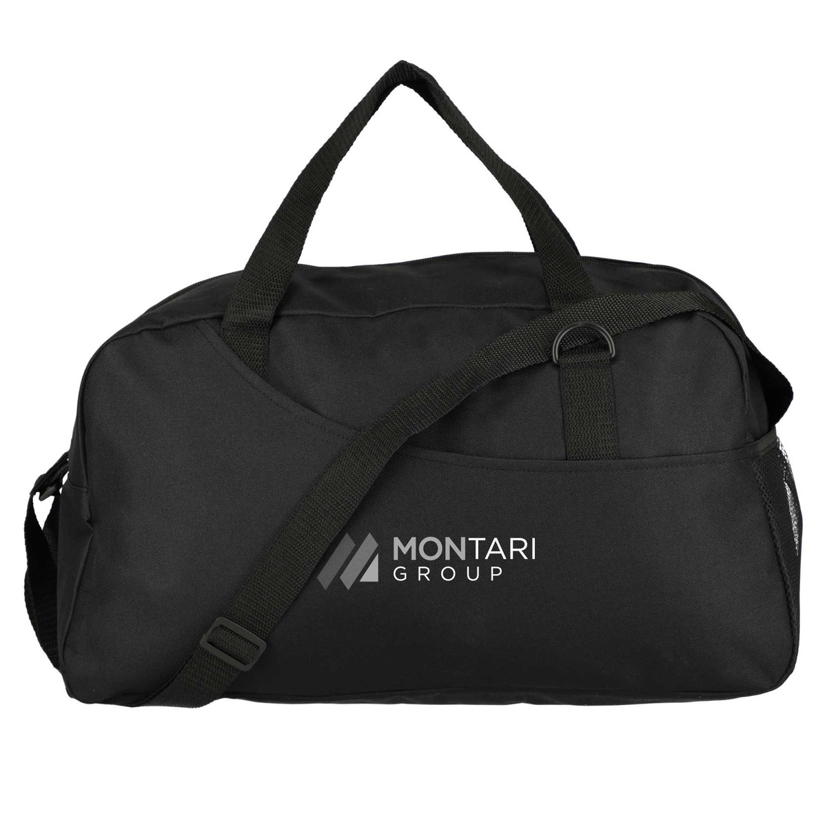 The Swoop Duffle is an ideal weekender — classic duffle design with an elevated look. This duffle features a large, zippered main compartment for easy access and a large open exterior front pocket for extra storage. Easily carried using the 2 sturdy grab handles. This duffle also includes a key loop to attach accessories and a mesh water bottle pocket on the side. Made from durable 600d recycled polyester. 9.00" D x 20.00" W x 11.00" H