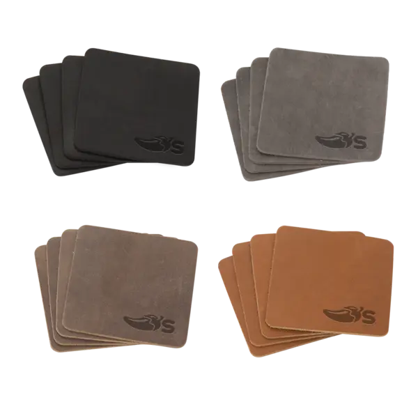 This exclusive set of coasters is all that separates the condensation of water vapor droplets plummeting down that frosty glass to your heirloom table. Wick that capillary action. Choose from a variety of domestic, USA Made, leather colors and customize to match your company logo to create something truly unique. Complies with Prop 65. 4" W x 4" H