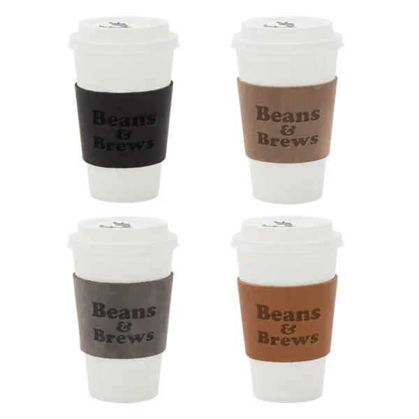 The convergence of science , magic, and art. Working leather as a raw material to perfectly fit your cup cannot be easily understood or improvised. Encircle your brand in and experience that tastes like success. Choose from a variety of domestic, USA Made, leather colors and customize to match your company logo to create something truly unique. Complies with Prop 65. 3.375" W x 2.5" H