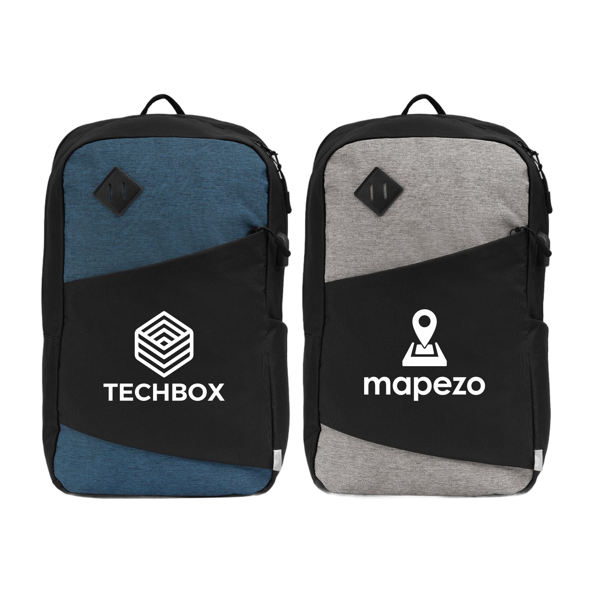 Introducing the Techpack - 300D rPET Commuter Backpack, the ultimate companion for daily adventures. Crafted from 300D rPET polyester with a 210D lining, it features two main compartments and a zippered front pocket for ample storage. Equipped with a padded sleeve that fits a range of laptops including 13'', 14'', 15'', 16'' and 17'', adjustable padded shoulder straps, and a top handle for easy carrying. It includes a hidden zippered pocket, trolley strap, and USB charging port (2A/10W) for staying connected on the go. Complies with Prop 65. 18.50" H x 10.63" W x 5.12" D