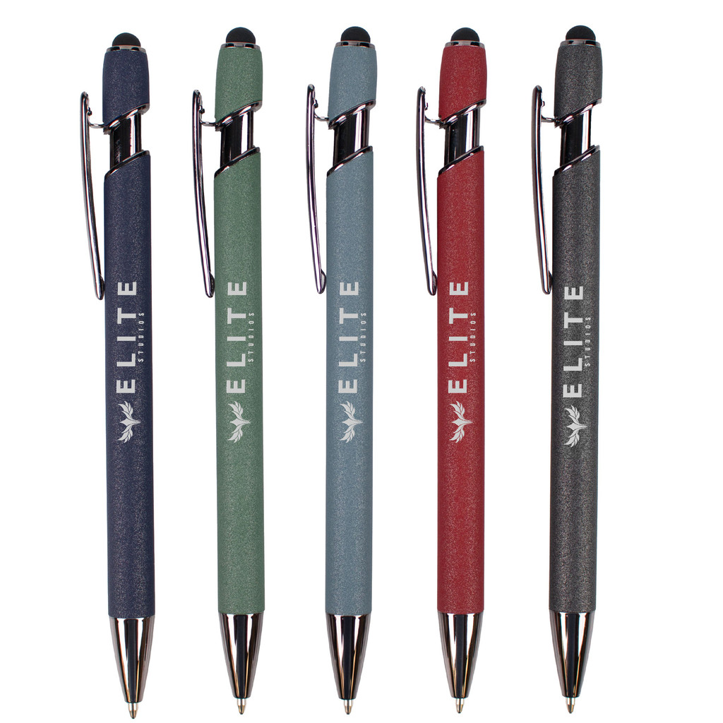 The Textari Rainier pen offers sophistication with its soft-touch executive stylus design in dappled earth tones and sleek gunmetal trim. Featuring smooth black ink and a handy stylus for increased connectivity, it ensures an exceptional writing experience while keeping your message top of mind with its generous imprint area. Material: Aluminum Standard Decoration Includes: Laser Engraved On Barrel All Available Decoration Options: Laser Engraved: 2" W x 0.25" H Barrel Expanded Engraving: 2" W x 0.375" H Barrel Straight Line Copy: 2 lines of 32 characters at 8pt Tip Type: Ball Point Standard Packaging: Bulk Tags: Popular, Metal, Gift, Desk, Office, Executive, Advertisement, College, Grade, Writing, Merchandise, Study, High School, University, Essay, List, Home, Pen, Classic, Trade Show