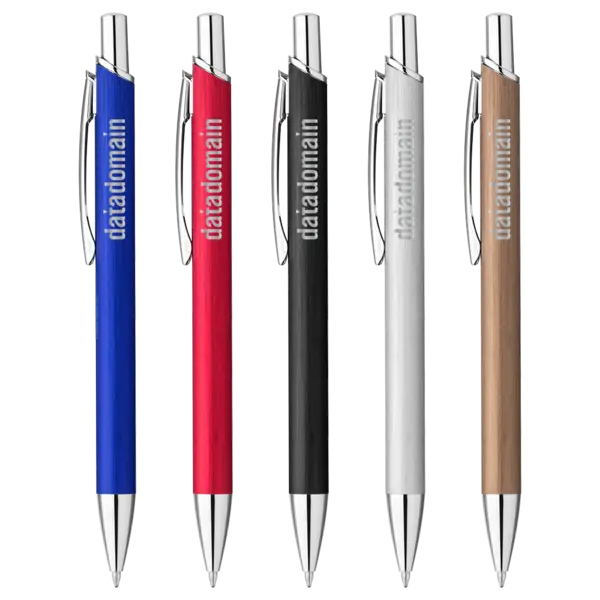 Plunge action ballpoint pen with sophisticated brushed aluminum barrel and shiny chrome accents. Black ballpoint ink. Unique metal textured barrel. 5.625" D x 0.4375" W