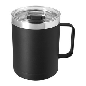 The Viking Collection® 14 oz. Stainless Steel Camp Mug, vacuum-sealed, copper lining, powder-coated, with a flip lid and straw hole. 3.4375" Diameter x 4.3125" H