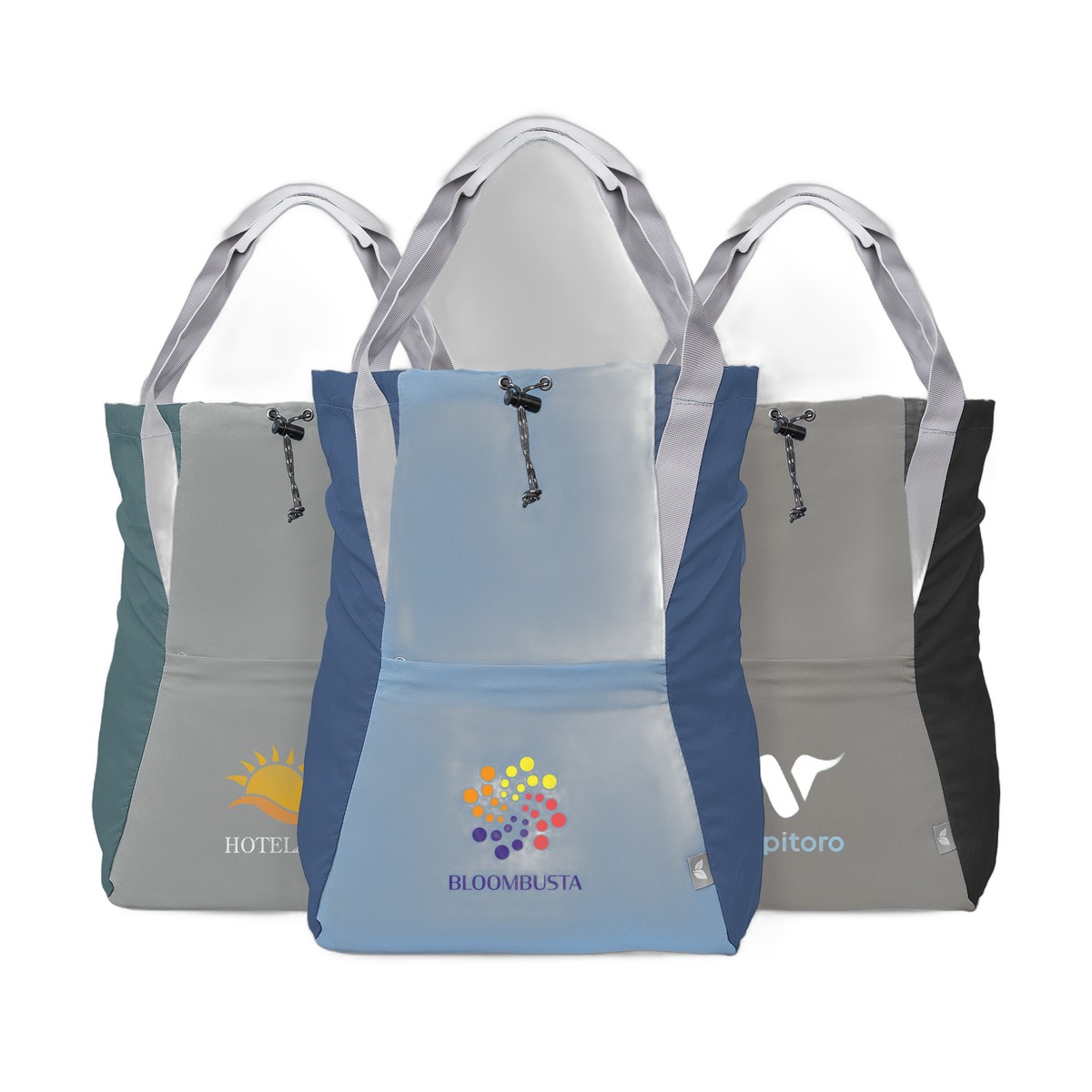 The Tilden Tote & Backpack is a versatile bag that adapts perfectly to any occasion. This 16-liter bag lining is made from lightweight T400 100% post-consumer recycled polyester (rPET), offering an alternative material with the look and feel of premium nylon. Its dual functionality allows it to be used as a tote bag (with two top webbing handles) or quickly converted to a backpack (with two adjustable shoulder straps), providing flexibility for daily use or travel. The main compartment closes securely with a rope and plastic buckle, and includes a small interior pocket for valuables, plus a zippered front pocket. Inspired by modern retail trends, the Tilden is a stylish and practical everyday accessory. 17.72" H x 15.75" W x 5.12" D