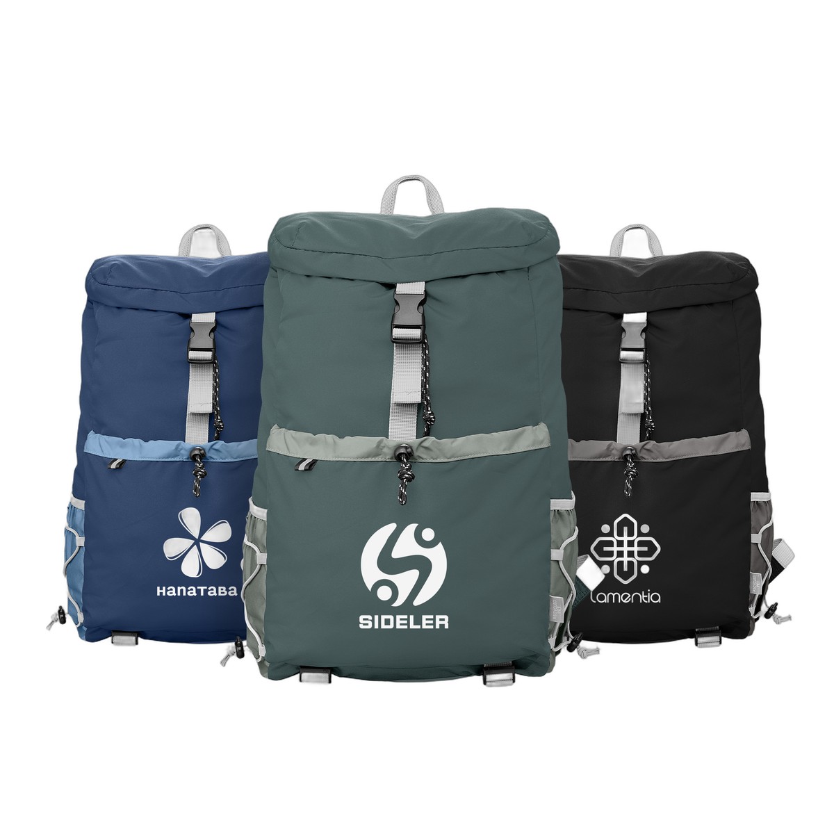 The Tilden Backpack is a soft, functional, and highly versatile bag designed for travel and outdoor activities. The panel and lining are crafted from lightweight T400 100% post-consumer recycled polyester. This 20-liter backpack has a look and feel similar to nylon while maintaining strong responsible credentials. The padded laptop compartment secures a wide range of devices, including 13", 14", 15", 16", and 17" laptops. It offers extra travel utility with two adjustable straps at the bottom to secure items like a jacket or towel, and two adjustable side pockets with elastic cords. The main compartment closes securely with a rope and plastic buckle. The Tilden backpack provides organized storage and comfort for any journey, with adjustable shoulder straps and a top handle. 18.90" H x 12.20" W x 5.51" D