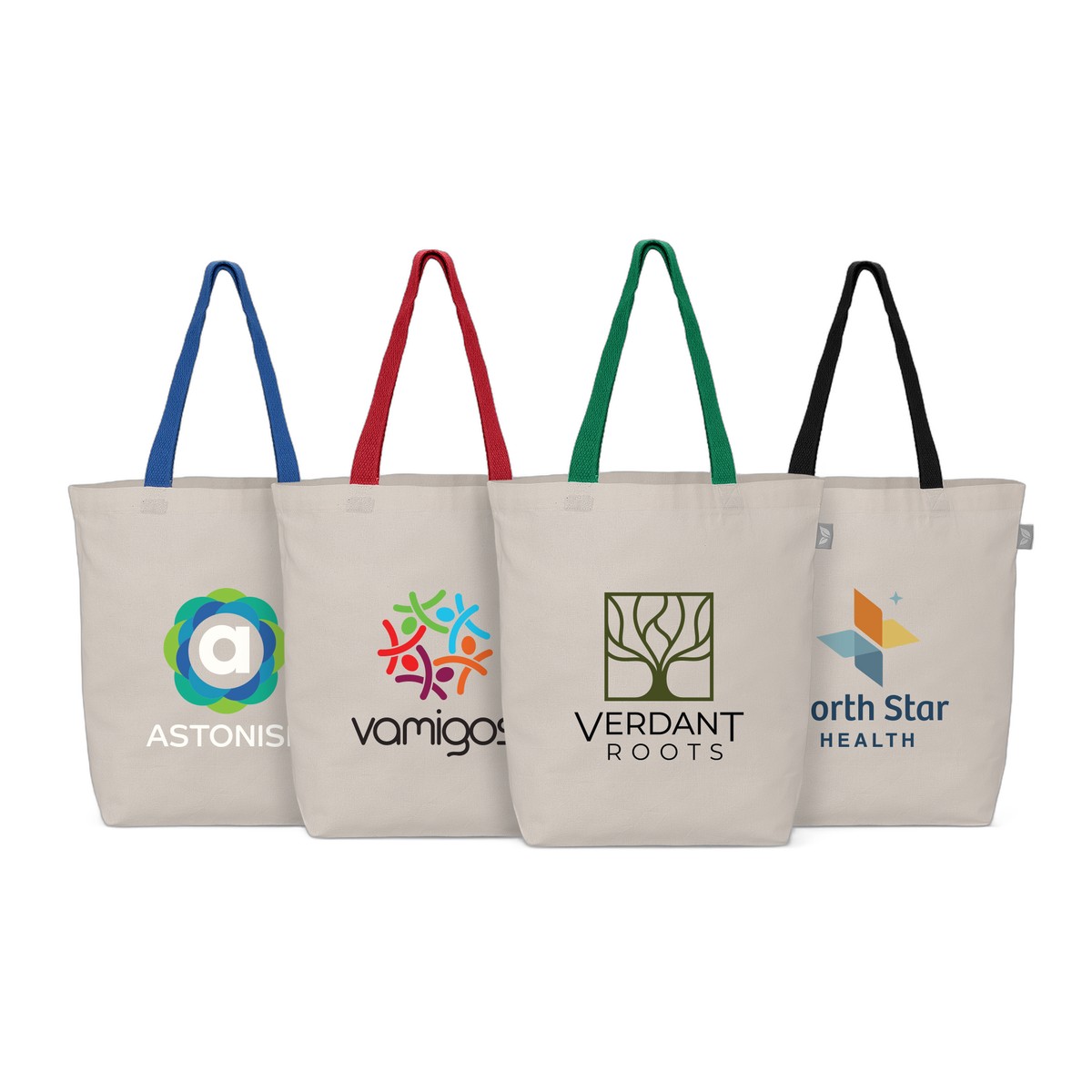 Coming Soon- Early April. The Tonga Bag is a cost-effective tote that adds a pop of color to your brand. This classic shopping tote's body is made from a durable blend of 70% pre-consumer recycled cotton (5 oz) and 30% post-consumer recycled polyester (rPET). The bag features a natural base contrasted by colored handles made from recycled cotton, giving it a distinctive and stylish look. With an 11-liter capacity (max weight 10kg), it's a versatile bag perfect for daily errands, groceries, or events. The Tonga includes a Digital Product Passport and sewn-in QR code tag that verifies its material story. 13.78" H x 14.96" W x 5.12" D