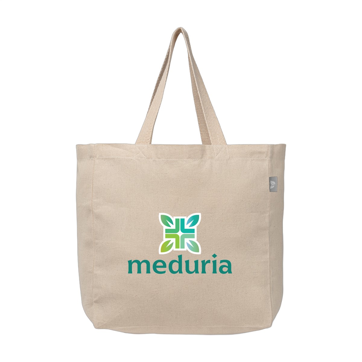 The Toronto Recycled Cotton Shopper Tote Bag features a substantial 8 oz. fabric weight, made with 70% recycled cotton and 30% recycled polyester. There's a generous gusset that is over 7" deep, allowing the bag to expand for your shopping adventures. Your logo will be imprinted front and center in 1-color silkscreen. Complies with Prop 65. 12.60" H x 12.20" W x 7.48" D