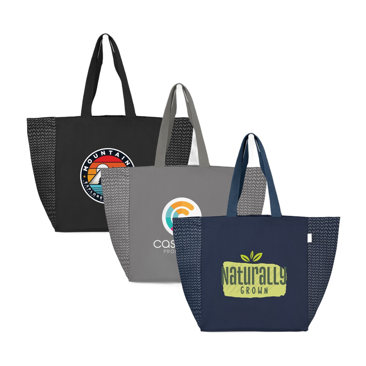 Toronto Recycled Cotton Chevron Tote Bag – 8 oz features a chevron print on both sides, combining style and practicality for everyday use. It is crafted with durable cotton webbing handles reinforced by X stitching, ensuring strength and comfort. The bag has a spacious 17-liter capacity and includes an inner label with a QR code for the Digital Product Passport, offering additional product information. Complies with Prop 65. 12.20" H x 12.60" W x 7.48" D