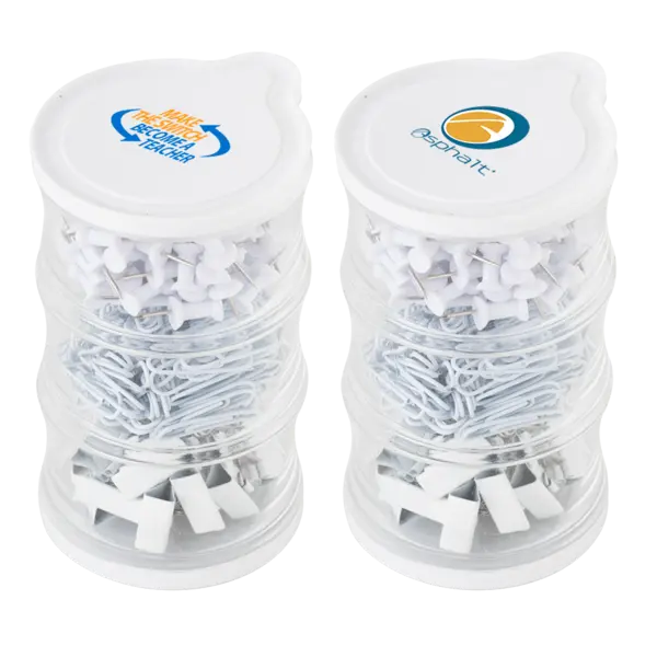 Three tier, swivel open tower desk organizer. Color matching lid and base with clear compartments. Comes with color matched 19mm binder clips (14 pieces), push pins (90 pieces), and 28mm paper clips (120 pieces). 4.75" H x 3.125" W