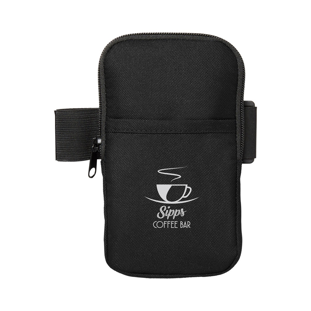 Designed for convenience and style, this versatile Recycled Polyester pouch securely wraps around your favorite drinkware, offering a hands-free solution for life's essentials. Elasticized strap with a hook and loop closure allows it to fit bottles and tumblers of various sizes. Zippered main compartment. Front open slash pocket (approx. 3.93"W x 4.52"H). Hand wash only. Recommended weight tolerance: 1 lbs. 3.9000" W x 6.9000" H x 0.6000" D