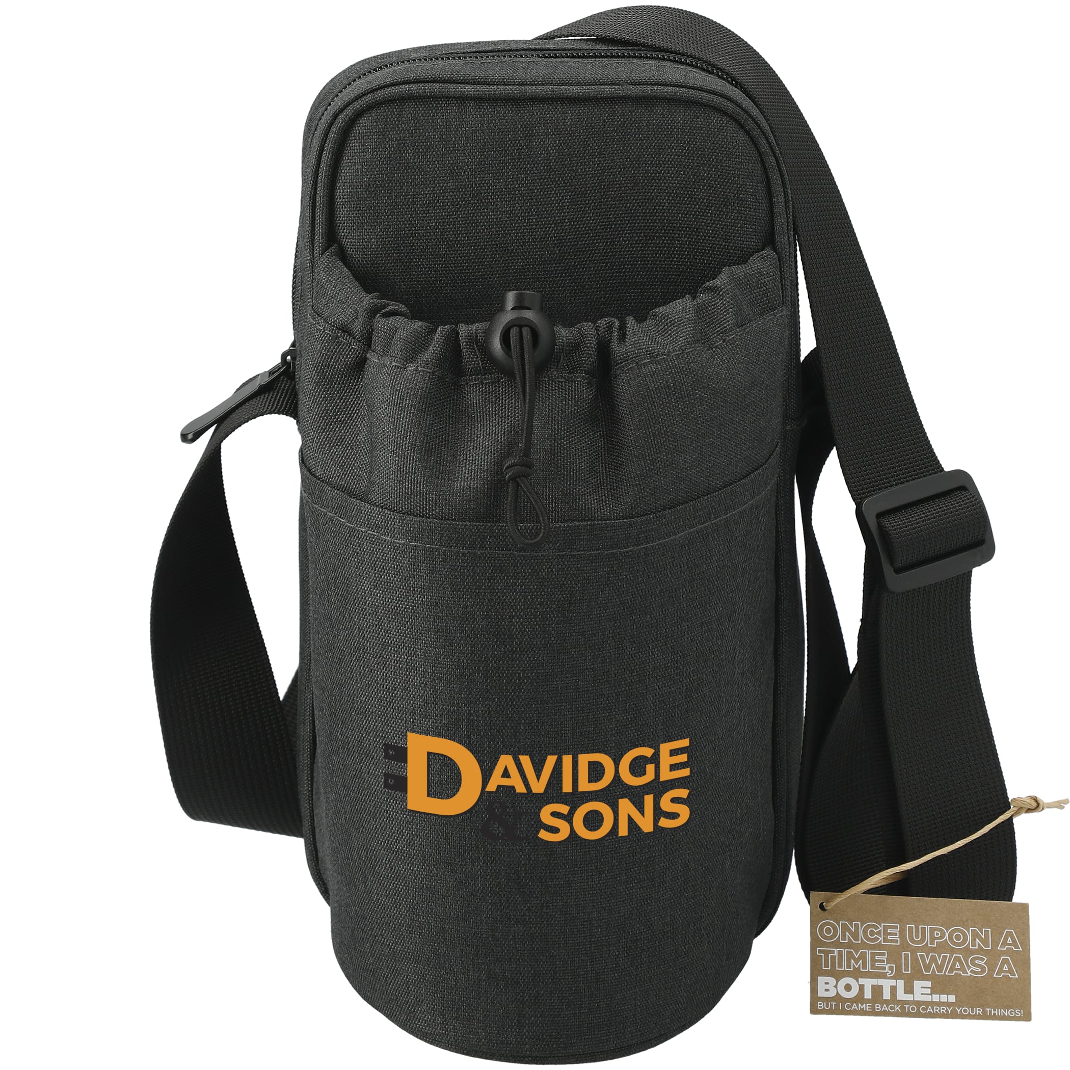 The Traver RPET Adjustable Bottle Sling Cooler w/ Pouch provides convenient, hands-free carrying for drinkware bottles. The insulated cooler liner helps keep your beverages cold while preventing condensation on sport bottles. An integrated toggle holds drinkware in place while inside the pouch. The zippered pocket features a built-in card organizer as well as elastic bands to store your accessories. Features an adjustable strap for on-the-go comfort. This product's main material is RPET 600d and its black lining and webbing are RPET 210d, which is made from recycled plastics, such as water bottles. Note: PEVA lining of pouch is not made with recycled materials. Includes interior ID label. Disclaimer: There may be minor variations in color of the actual product due to the nature of the fabric dyes, weaves and printing. Bottle sold separately. The maximum diameter of the bottle that can be inserted into the bottle holder is 3.5". 1.77" D x 4.70" W x 9.25" H