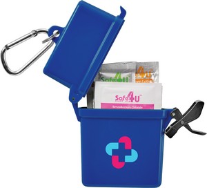 The Bullet Trek 8-Piece Waterproof First Aid Kit is a mini first-aid kit in a flip-top waterproof floating container. This kit includes a metal mini-carabiner for convenient first-aid care. This portable first-aid kit includes two adhesive bandages, two antiseptic wipes, a Hand Sanitizer packet, two SPF30 Sunscreen packets and one packet of aloe/after sun care. The sunscreen in this convenient kit does not contain Octinoxate or Oxybenzone. The Bullet Trek 8-Piece Waterproof First Aid Kit meets FDA requirements and is available for shipment within the United States (including Alaska, Hawaii, and Puerto Rico).See General Information page for additional air shipment charges. Not available in Canada. 0.59" D x 3.34" W x 4.21" H