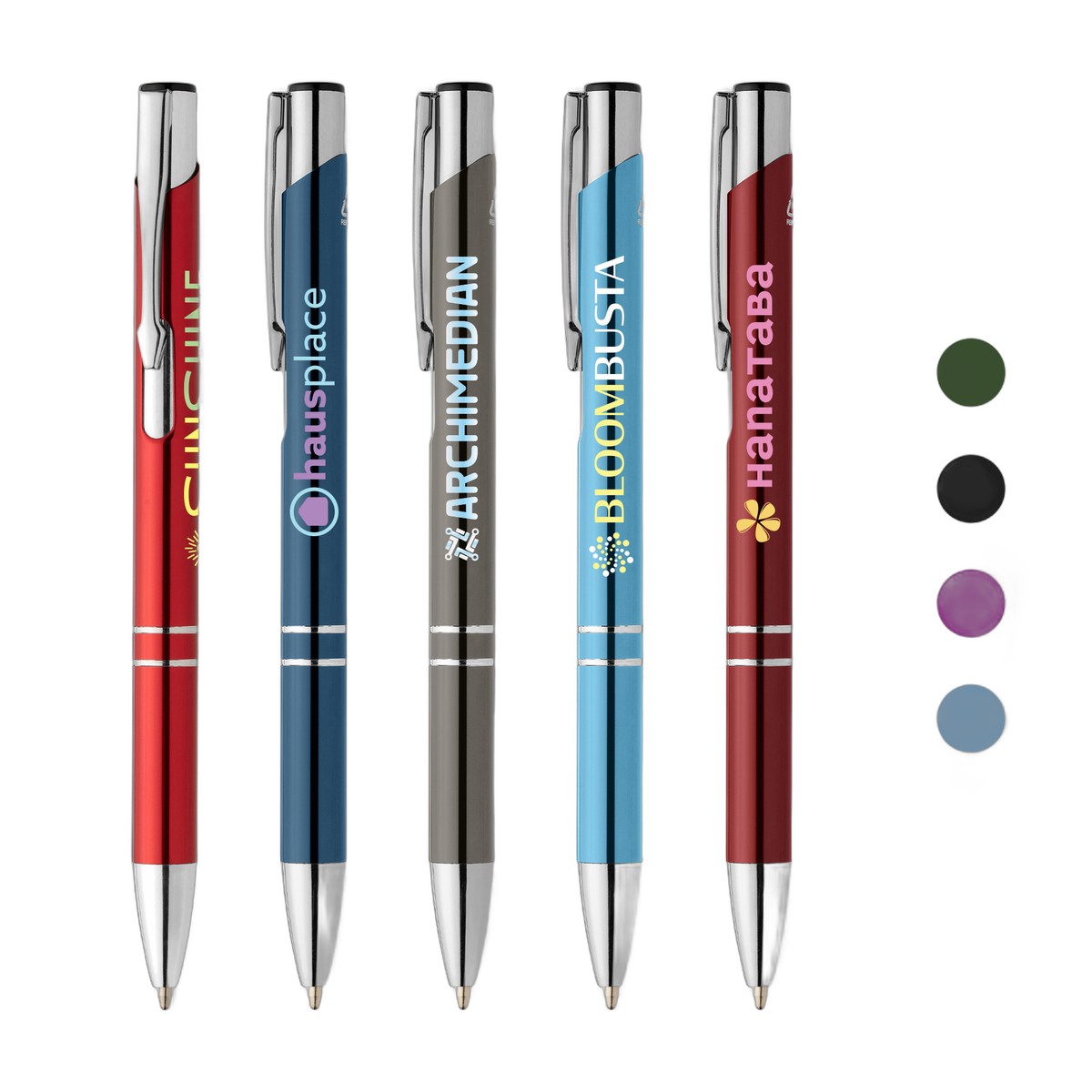 Our popular Tres-Chic Pen is an upgrade to a top-selling, classic design. This retractable metal pen has been redesigned to feature a barrel now crafted from recycled aluminum featuring a smooth, vibrant shiny metallic finish. The pen maintains a sophisticated appeal with brilliant chrome trim on the steel clip and on the tip and plunger (made from rABS plastic). Equipped with a slim German Dokumental ink refill, the Tres-Chic delivers smooth writing through a 1.0mm tip and provides a reliable 500-meter write out length in both black and blue ink. This pen offers the same beloved performance and style as the original, now with a superior, conscious material story and a polished look. 5.39" W x 0.39" D