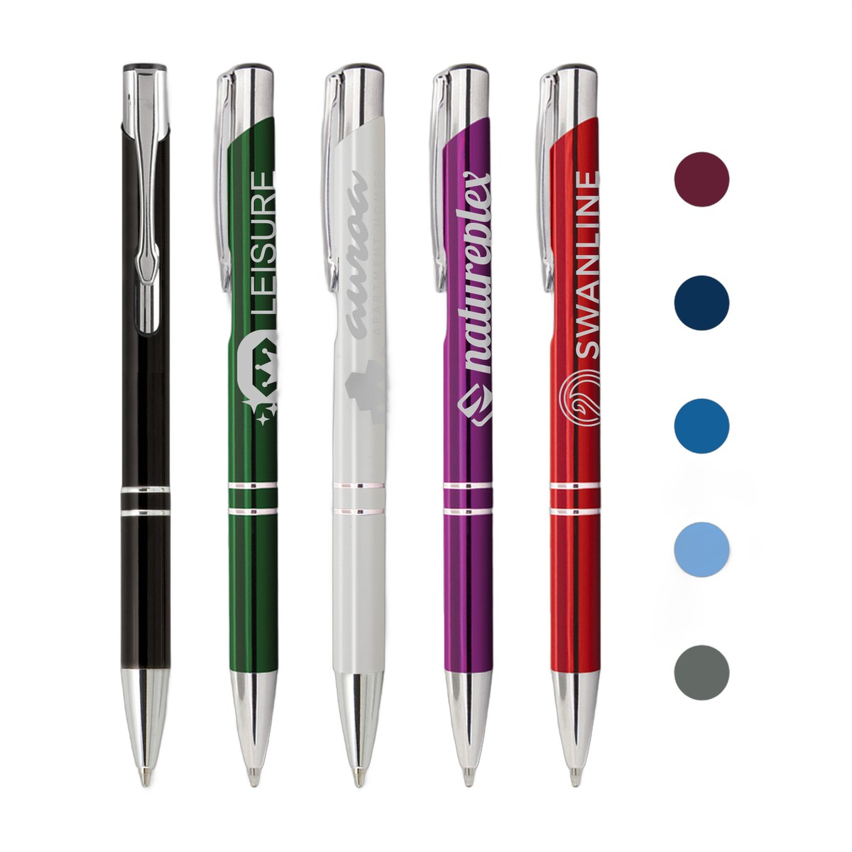 Add a sleek and refined look to your marketing plan with the Tres-Chic Pen! Available in blue or black ink and multiple barrel colors, including an assortment, this medium ballpoint pen features chrome accents to help highlight your company name, logo and advertising information. Customize it using our precision laser engraving. Stand out from the other companies in your industry with an amazing promo pen that everyone will want to get their hands on! Complies with Prop 65. 5.37" W x 0.39" D