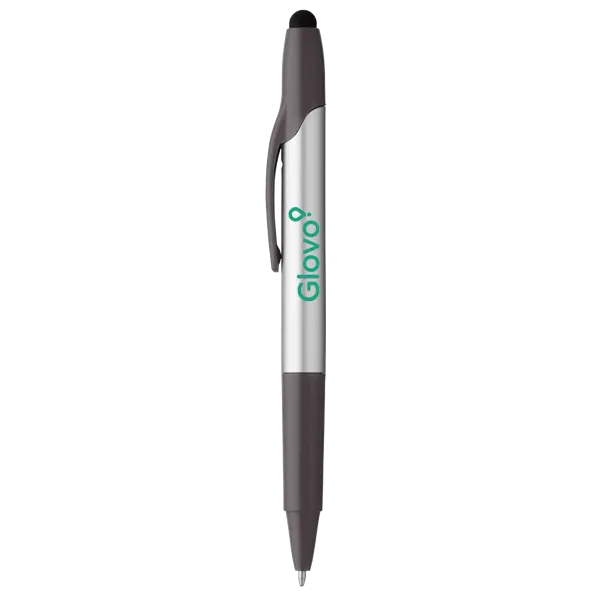 Twist action ballpoint pen with touch capacitive stylus. Silver barrel with color accent clip, tip, and grip. Color matching highlighter in stylus cap (gunmetal pen has yellow highlighter ink). Black ballpoint ink. 5.75" D x 0.5" W