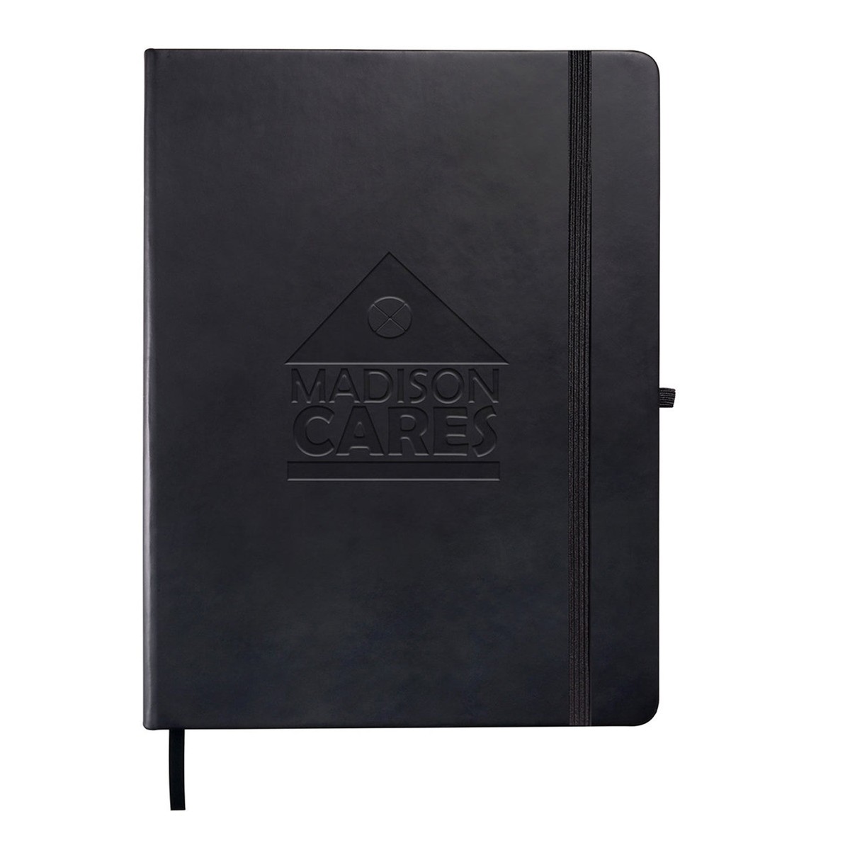 96 ruled pages with color-matching elastic closure, elastic pen loop and bookmark. Document pocket on inside back cover.