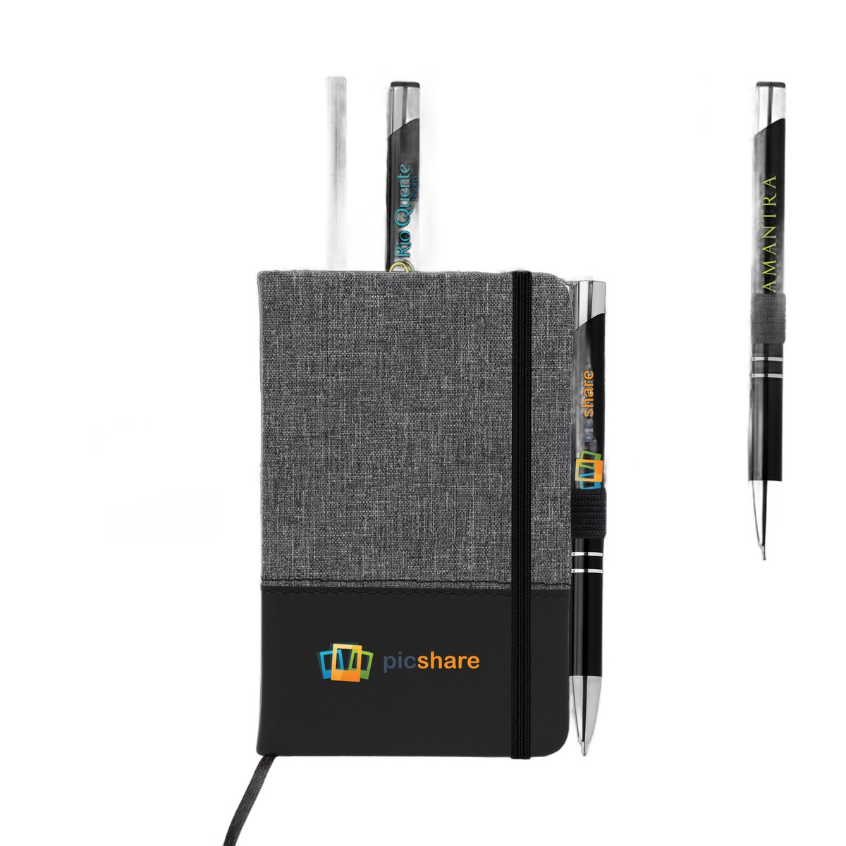 The Twain Notebook & Pen Gift Set features a 4" x 5.6" notebook with premium heathered gray textured cover containing 96 Sheets (192 pages) of ivory lined paper, plus our popular Tres-Chic metal pen. The pen, ribbon marker, elastic strap, and pen loop are black for a contrasting look. Customize using ColorJet, with full-color imprint on both the pen and notebook cover. Complies with Prop 65. 5.59" H x 3.90" W x 0.59" D