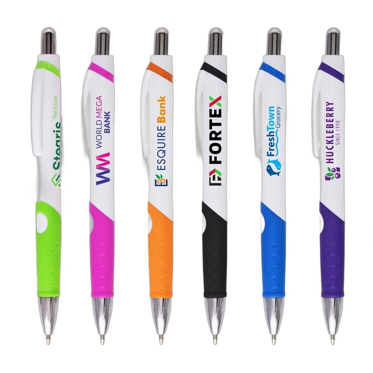 The Tyler Pen is a sleek retractable plastic ballpoint pen with a chrome-plated nose cone and plunger, and soft rubber grip, available in a range of bright colors. Promote your brand with a 1-color silkscreen imprint. Complies with Prop 65. 5.48" W x 0.43" D