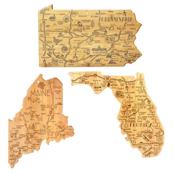 Bamboo Cutting and Serving Boards shaped like your favorite destinations! Crafted from high-quality, sustainable bamboo, these boards are both functional and stylish. Perfect for food prep or serving, each board showcases your favorite state in intricate detail. They add a personalized touch to any kitchen or dining experience. Celebrate your favorite destination with a practical and charming addition to your culinary collection!