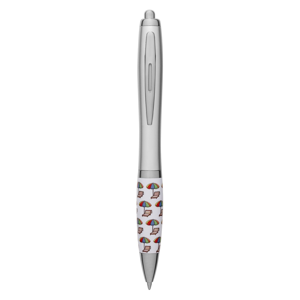Retractable curvy plastic barrel ballpoint pen with Prime's exclusive stock art grip featuring a Vacation theme with beach umbrella and lounge chair. Includes metallic silver clip and accents. Click-action pen with high quality, German black medium-point ink. Note: Due to the nature of the manufacturing process, backside of grip graphic will include visible seam. 46% of this item's total composition is made from recycled materials, and the material itself contains 100% post-consumer recycled content and loaded to system. 5.5000" L x 0.5000" Diameter