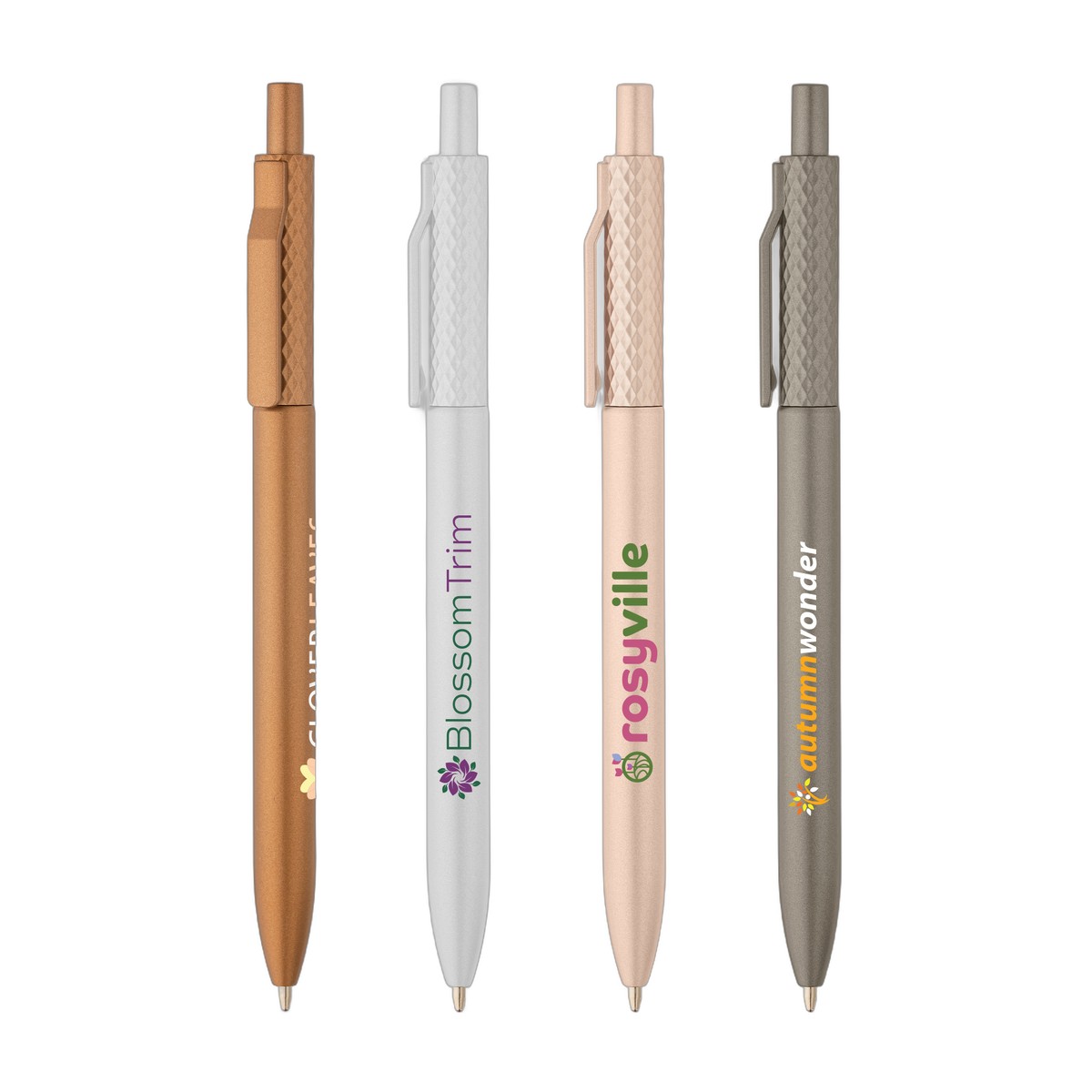 Discover a touch of everyday brilliance with the Vale rABS Matte Metallic Textured Plastic Pen. This isn't just a pen; it's a statement of style, crafted from molded recycled ABS plastic. Its sleek, matte metallic finish shimmers across every component, while a trendy knurled diamond-texture at the upper barrel offers both enhanced grip and captivating visual appeal. Designed for a smooth, consistent experience, the Vale Pen features a push-action mechanism and an X-20 slim refill, delivering 500 meters of effortless black dokumental ink. Available in sophisticated shades of Rose, Gun, Silver, and Bronze, it's the perfect, polished choice to elevate promotions, giveaways, and everyday business with undeniable flair. 5.71" W x 0.39" D