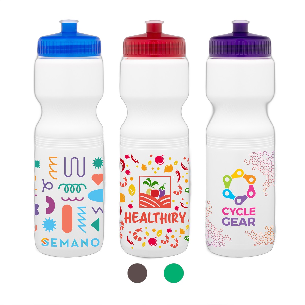 Made in USA. The 28 oz. Velocity Sports Bottle offers a blank white canvas to feature your logo. Made of lightweight HDPE plastic, this bottle has a push/pull spout lid that comes in popular translucent colors. Easily fits into bicycle water bottle holders. Up to 30% recycled material. BPA-free and lead-free. CA Prop 65 Compliant and FDA Approved. Hand wash only. Complies with FDA, Prop 65. 7.99" H x 2.91" W