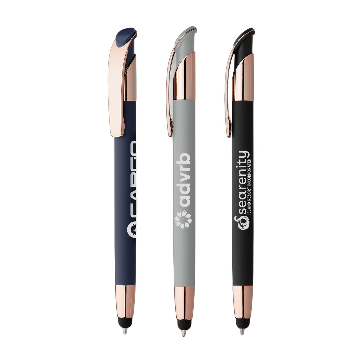 The Venice Softy Rose Gold metal pen features luxurious soft-touch barrels, paired with premium rose gold trim that highlights the elegant, curved clip design. The capacitive stylus adds helpful touchscreen functionality. . Complies with Prop 65. 5.71" W x 0.41" D