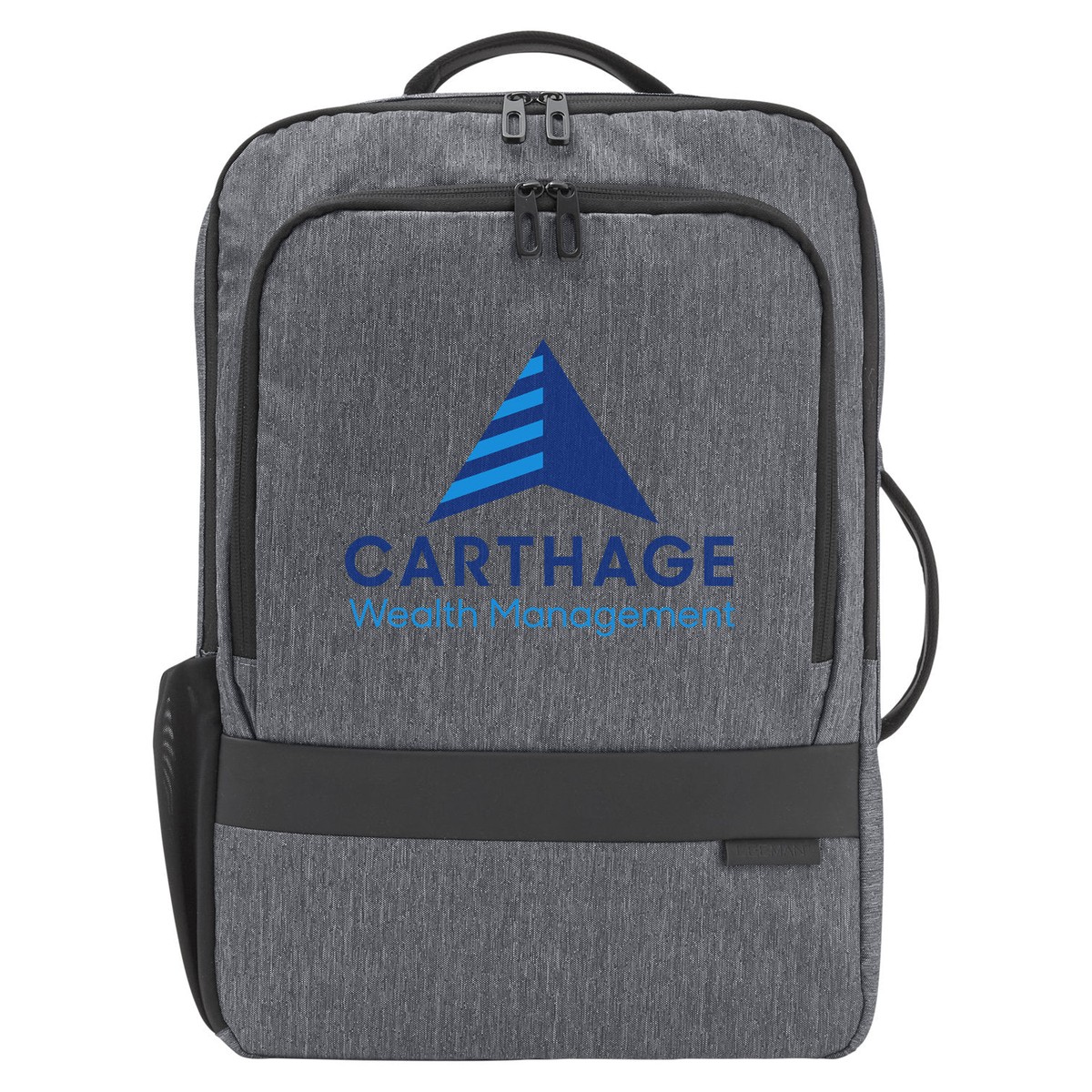 300D Recycled 2-tone Polyester bag. Sleek and versatile backpack converts to briefcase. Laptop pocket inside main compartment, fits most 15" laptops. Large front zippered pocket with organization including RFID pocket. Trolley pass and side mesh water bottle pocket. Padded shoulder straps and top carry handle. Hand wash with cold water. Recommended weight tolerance: 15 lbs. 12.2000" W x 17.7000" H x 3.9000" D