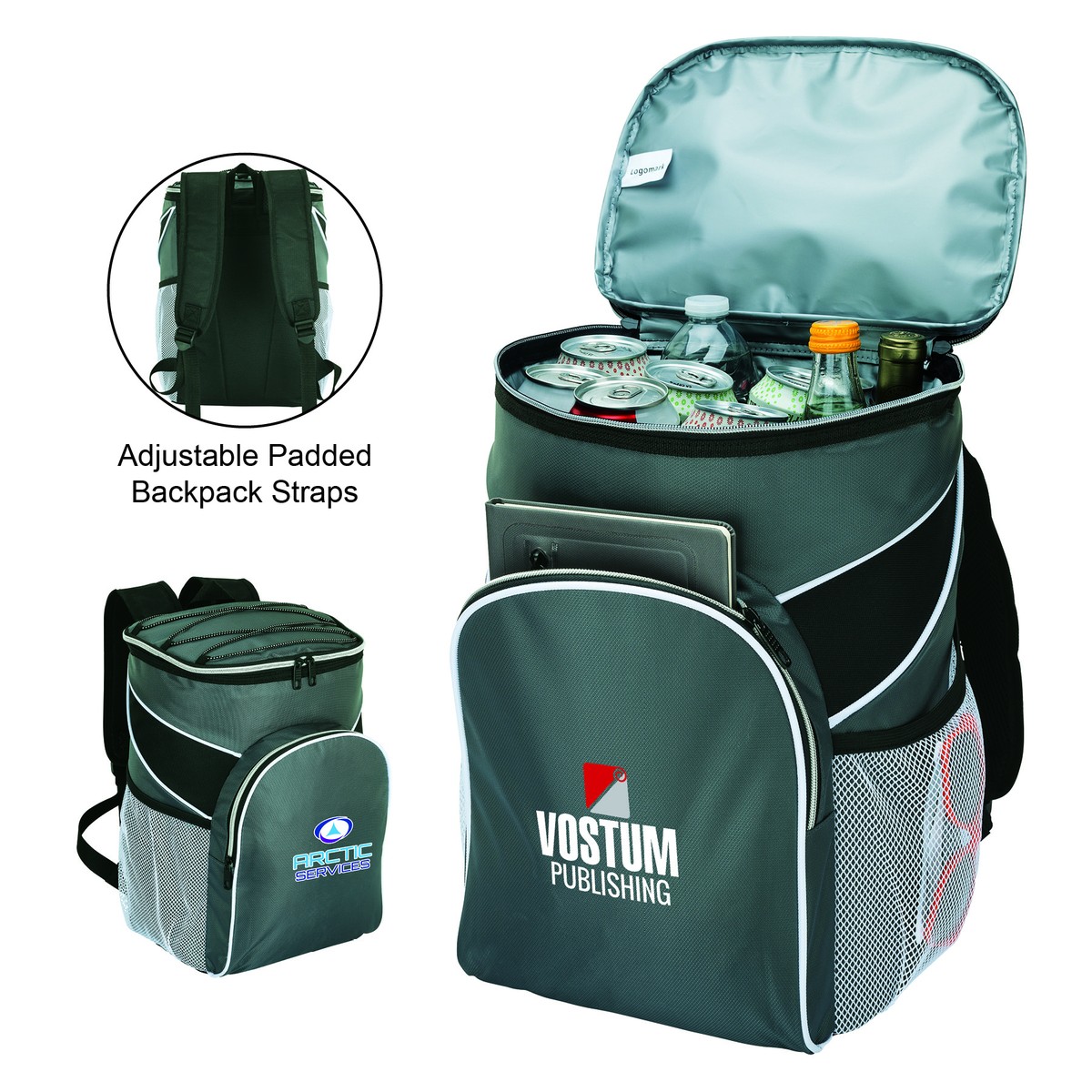 The Victorville backpack cooler is perfect for your next excursion or trip to the market. It has a 30-can capacity and is made of durable 600D polyester and 420D, has insulated PEVA lining and an elastic tie-down cord on the top compartment closure. Two mesh side pockets flank the outside of the bag, and a front zipper compartment provides plenty of room for items you don't need to keep cold. Comes with a carry handle and padded adjustable backpack straps. Complies with Prop 65. 10 1/4" W x 15 1/8" H x 7 1/4" D