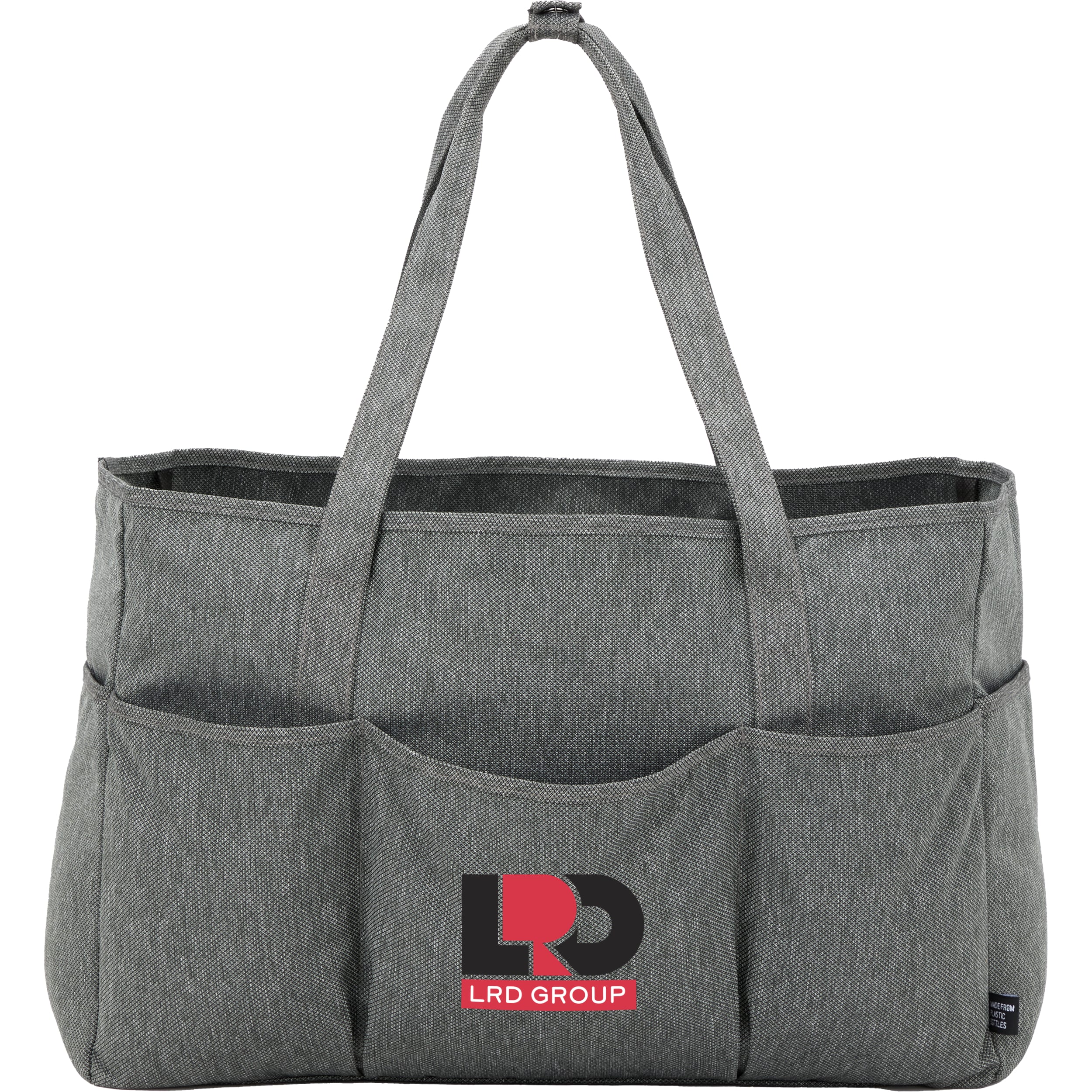 The Vila Recycled Utility Tote is large enough and tough enough to handle almost anything you throw at it. From carrying all the teaching and craft supplies for class full of students to hauling the family's essentials to an all-day softball tournament, the Vila Utility Tote is the go-to carry-all that keeps you organized without carrying multiple bags. Featuring a large open main compartment and five exterior pockets for maximum organization. Two sturdy 10.5-inch handles allow you to throw this tote over your shoulder, and the handles can be snapped together. Reinforced pocket openings and handles for extra durability and the foldable design saves space when the tote is not in use. Crafted from durable 600D rPET. 7.00" D x 18.00" W x 12.50" H