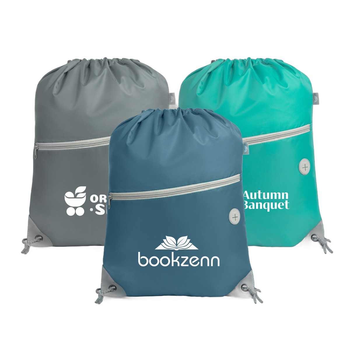 Place your logo on a bag that will be worn everywhere. This Vilda rPET Drawstring Backpack with Zippered Front Pocket is ideal for promoting company logos on the go. It is made of durable polyester and includes a drawstring closure. Lightweight yet strong, this drawstring backpack travels well and makes for a great event giveaway item. This reusable promotional marketing tool is an excellent investment for companies looking to boost their brand awareness. . Complies with Prop 65. 17.72" H x 13.78" W