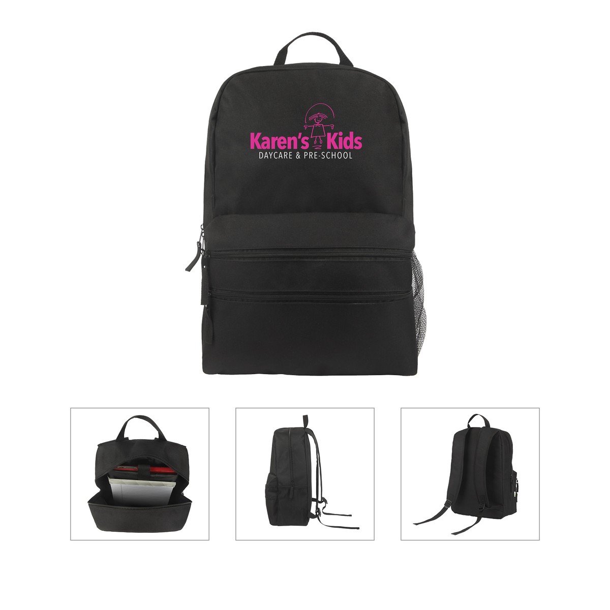 Discover the perfect blend of durability and sustainability with the Virtu RPET Laptop Backpack from the Eco-Lifestyle Collection. Crafted with RPET material made from recycled water bottles, this backpack has a large zippered main compartment with padded laptop pocket that holds computers up to 15.6" and 2 front zippered accessory pockets. The David also features a top carry handle, side mesh water bottle pocket, and comfortable adjustable padded backpack straps, combining functionality with eco-conscious design. Complies with Prop 65. 11 1/2" W x 16 3/4" H x 5" D