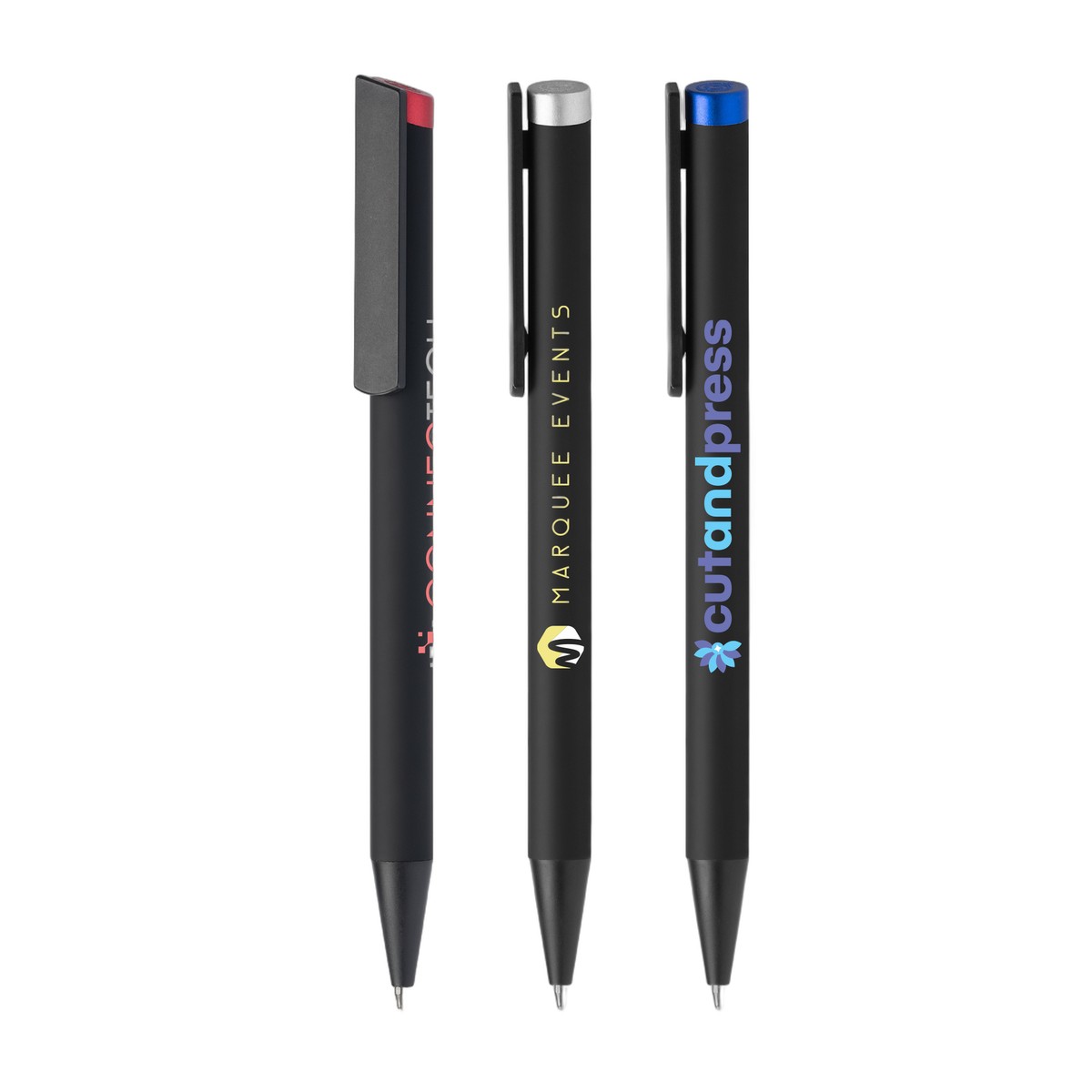 Experience premium writing with the Volos Recycled Aluminum Color Mirror Finish Ballpoint Pen. This sleek, elevated instrument is crafted from recycled aluminum with a soft-touch black rubberised finish. The polished plunger is designed to match the mirror-color imprint, creating a stylish, cohesive look when decorated with precise laser engraving on the barrel. The tip, made from black RABS plastic, adds subtle contrast and durable performance. The slim 1.0 mm tip delivers a smooth, consistent experience with Dokumental ink. With an 800-meter write-out and a balanced, weighted feel, this pen is built for professionals who value both performance and presentation. 5.71" W x 0.39" D