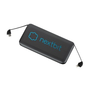 Matte metallic finish 10,000 mAh powerbank. Built-in tuck away cables (type-C and 2-in-1 8-pin style and micro-USB); LED battery indicator light; micro-USB input: 5V/1.5A; type-C input: 5V/2.1A; USB output: 5V/2.1A; polymer battery. 5.5" D x 0.625" H x 2.75" W
