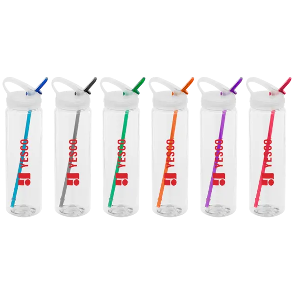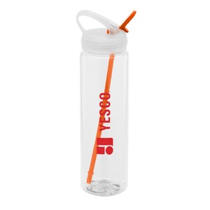 32 Oz. Clear PET plastic water bottle. Frosted lid with accent color flip-up spout and color matched draw straw; built in sport loop for easy transport. Fits in most cup holders; recyclable; handwash recommended. Made in the USA. 11" H x 2.875" W