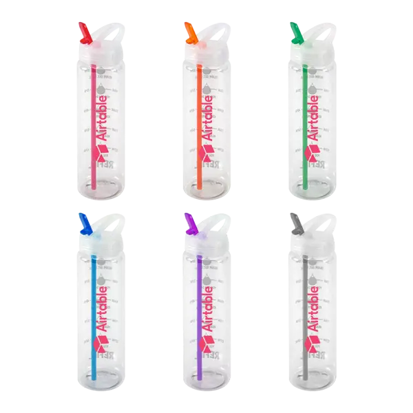 This is a 32 Oz. Clear PET plastic water bottle. It features a frosted lid with a accent color flip-up spout and color-matched draw straw. It has a built-in sport loop for easy transport, and a hydration mark for beverage measurement. Fits in most cup holders. Made in the USA. Complies with Prop 65. 11" H x 2.875" W