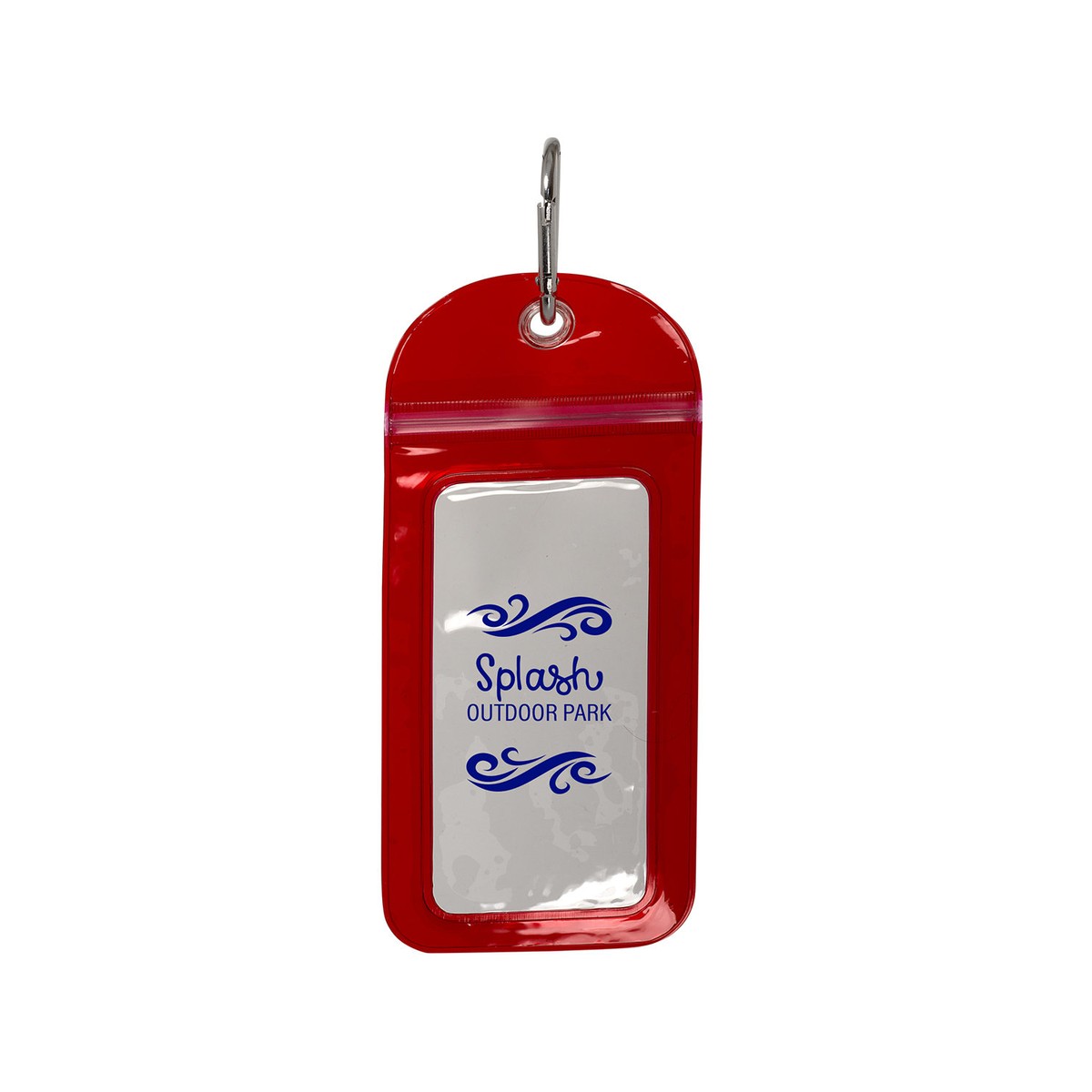 PVC water-resistant pouch for small mobile devices. Metal carabiner clip at top to attach to bags and belt loops (approx. 2.625"w x 1.375"h x 0.25"d in size). Helps prevent your device from getting wet. Clear display window measures approx. 3"w x 6.25"h. 4.5000" W x 9.7500" H