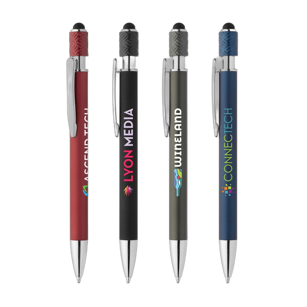 Designed for both function and fun, the Wave Aluminum Spinner Stylus Pen features a retractable aluminum barrel with a soft-touch rubber-painted finish for a comfortable grip. The unique rotating fixture on top allows the pen to spin effortlessly with a simple push of the thumb, offering an engaging fidget experience. The spinner section, made of ABS plastic, is textured with a chevron pattern and finished in metallic paint for added flair. The sleek chrome trim and black stylus on the plunger provide a polished, modern look. Equipped with a slim 1.0mm Dokumental Ink refill, it delivers a smooth 500m write-out for precise, reliable writing. Complies with Prop 65. 5.83" W x 0.43" D