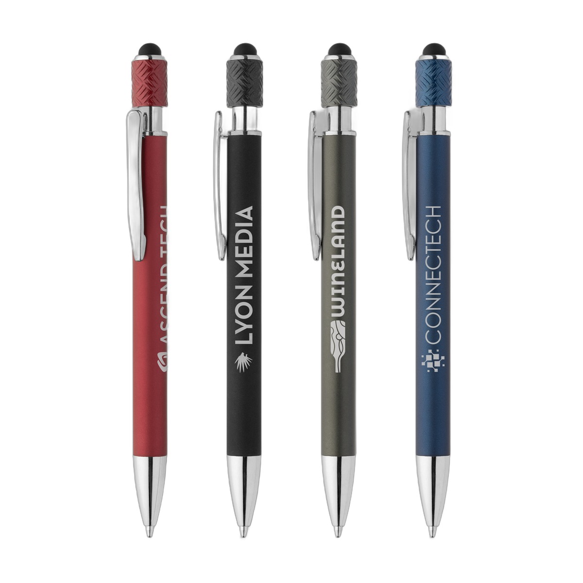 Designed for both function and fun, the Wave Aluminum Spinner Stylus Pen features a retractable aluminum barrel with a soft-touch rubber-painted finish for a comfortable grip. The unique rotating fixture on top allows the pen to spin effortlessly with a simple push of the thumb, offering an engaging fidget experience. The spinner section, made of ABS plastic, is textured with a chevron pattern and finished in metallic paint for added flair. The sleek chrome trim and black stylus on the plunger provide a polished, modern look. Equipped with a slim 1.0mm Dokumental Ink refill, it delivers a smooth 500m write-out for precise, reliable writing. Complies with Prop 65. 5.83" W x 0.43" D