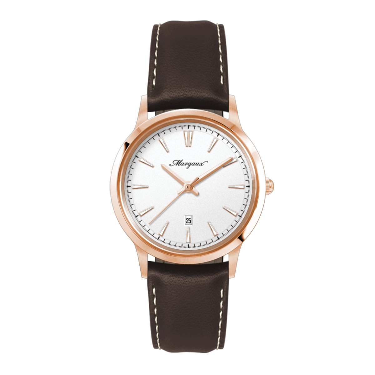 22mm steel rose gold case, 3 hand mvmt, white dial, dte display, leather strap, flat mineral crystal, 5 atm wtr resistant. Complies with Prop 65. 1" W x 1" H x 1" D