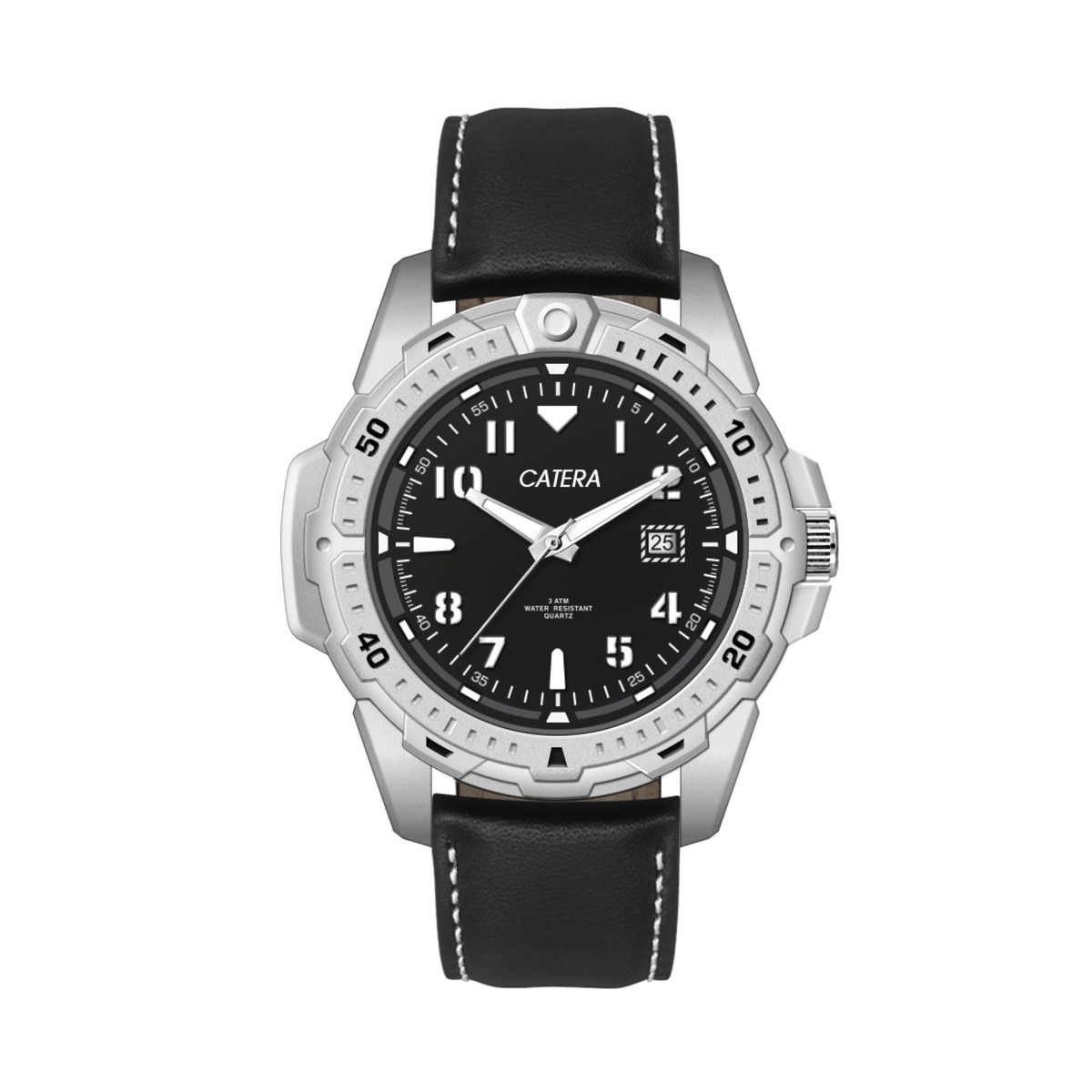 45mm metal matte silver case, 3 hand, dte display, black dial, leather strap, flat mineral crystal, 3 atm wtr resistant. Complies with Prop 65. 1" W x 1" H x 1" D