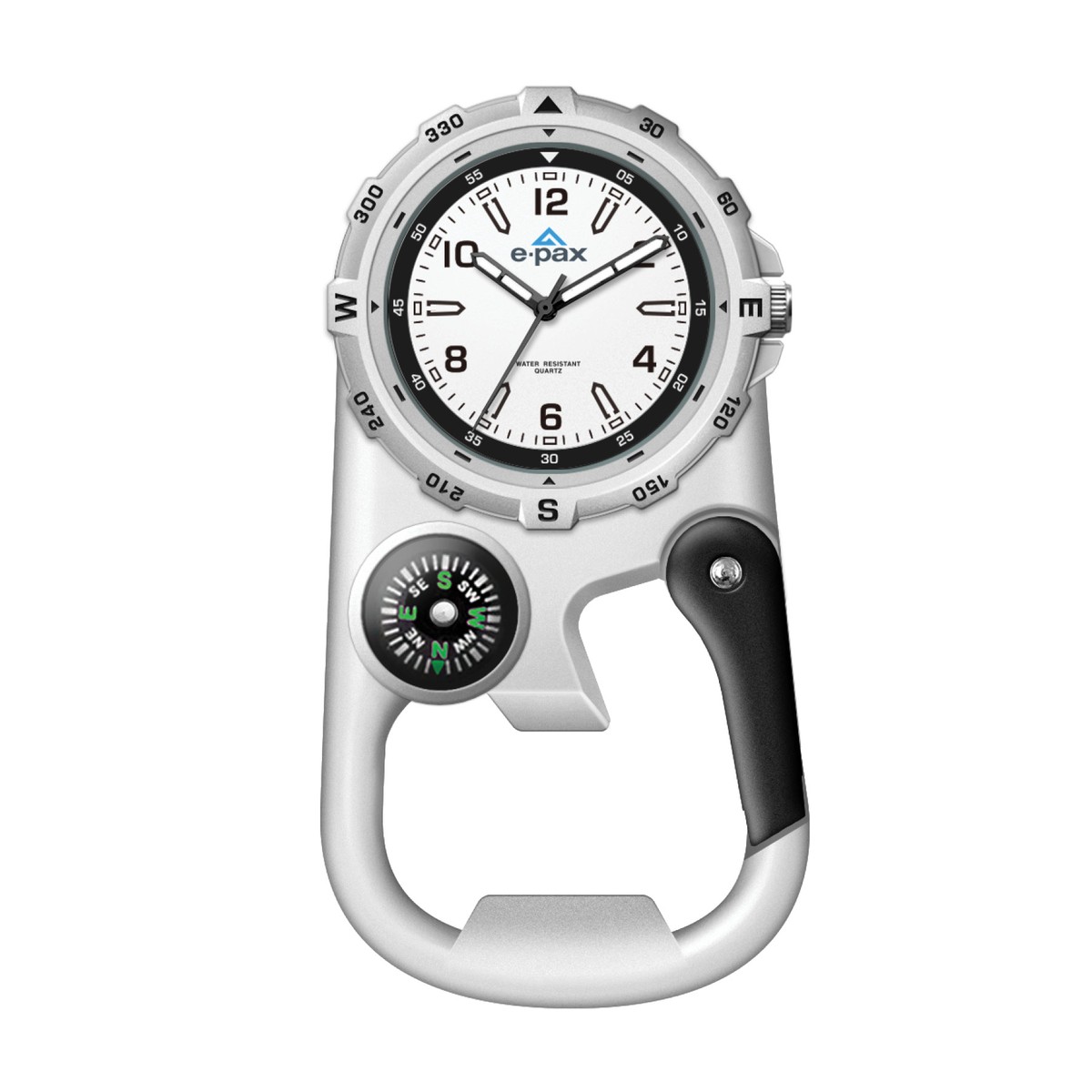 41mm metal matte silver pocket watch, 3 hand mvmt, white dial, compass, carabiner. Complies with Prop 65. 1" W x 1" H x 1" D